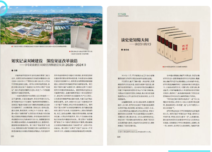 “好书品鉴”栏目刊发《如实记录双城建设深度见证改革前沿——评〈成渝地区双城经济圈建设(2020—2024)〉》《读史更知蜀天阔——读〈四川简史〉》2篇文章。前文介绍《成渝地区双城经济圈建设实录(2020—2024)》编纂始末,聚焦其选题、特征、价值和意义。后文记述了作者在阅读《四川简史》后的收获和启迪,作者认为该书内容简练、意蕴丰富,兼具思想性、学术性、史志性、科学性和易读性,是一部适合广大党员干部和青少年阅读的四川历史学习读物。