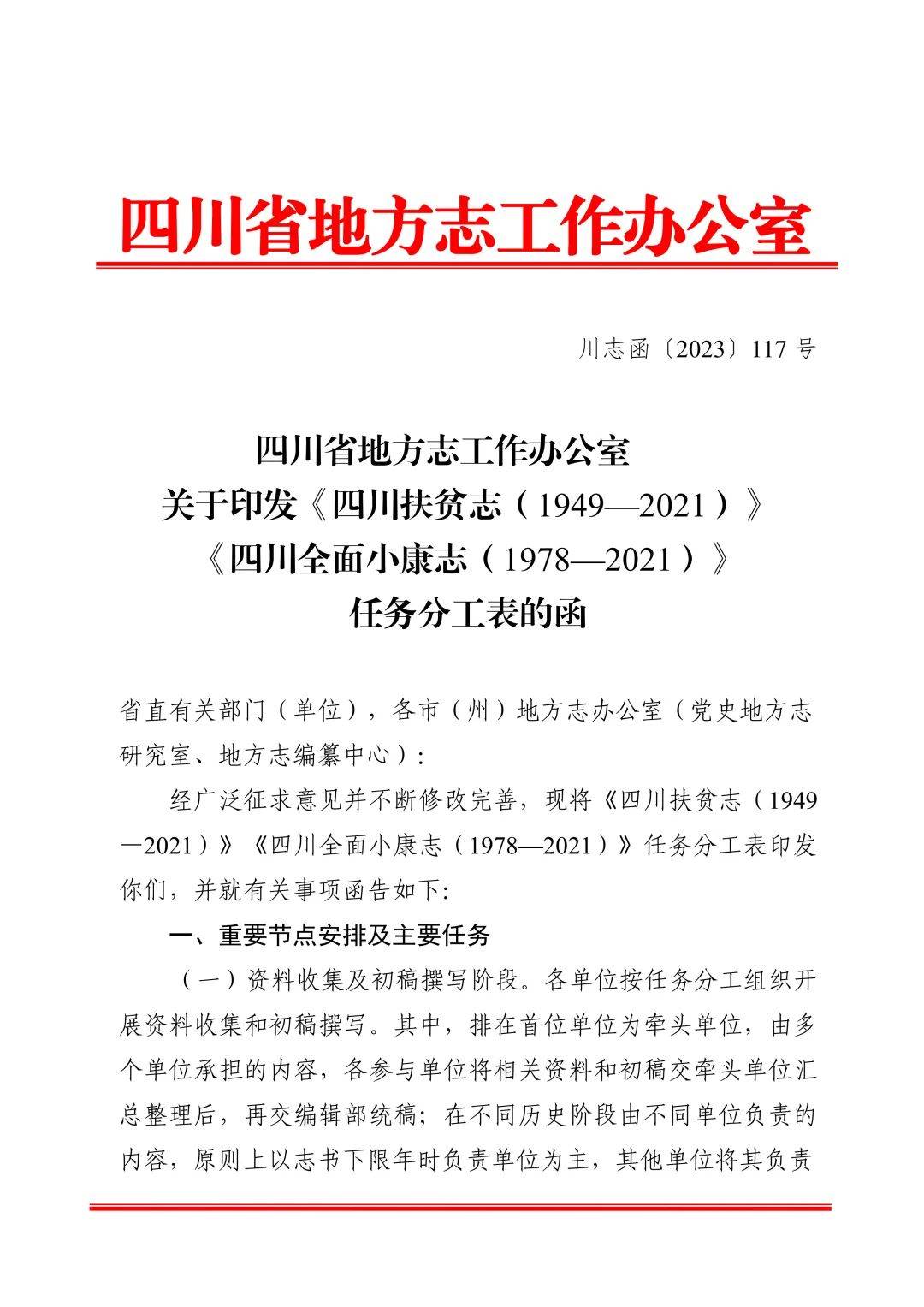 2023年12月25日,四川省地方志办印发《四川扶贫志(1949—20210》《四川全面小康志(1978—2021)》任务分工表。