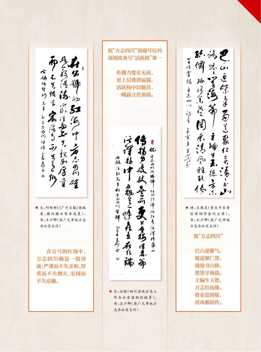 《巴蜀史志》2025年第2期封三:王雁灵、汪毅、何智新著文或作诗赞誉“方志四川”(书法:原广元市地方志办公室主任 王少卿)