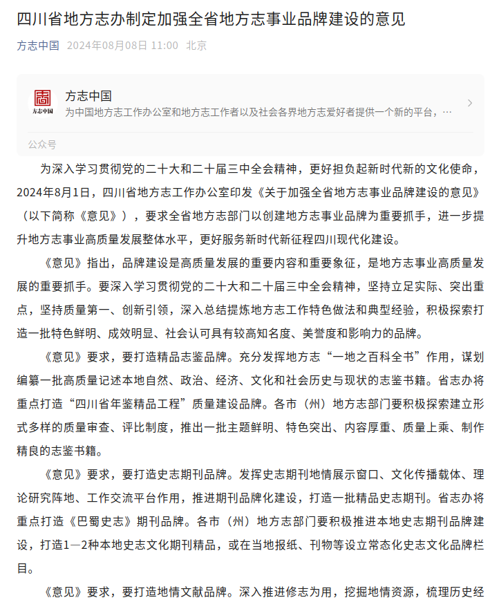 为深入学习贯彻党的二十大和二十届三中全会精神,更好担负起新时代新的文化使命,2024年8月1日,四川省地方志工作办公室印发《关于加强全省地方志事业品牌建设的意见》(以下简称《意见》),要求全省地方志部门以创建地方志事业品牌为重要抓手,进一步提升地方志事业高质量发展整体水平,更好服务新时代新征程四川现代化建设。