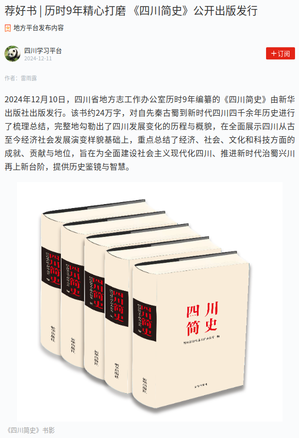 2024年12月10日,四川省地方志工作办公室历时9年编纂的《四川简史》由新华出版社出版发行。该书约24万字,对自先秦古蜀到新时代四川四千余年历史进行了梳理总结,完整地勾勒出了四川发展变化的历程与概貌,在全面展示四川从古至今经济社会发展演变样貌基础上,重点总结了经济、社会、文化和科技方面的成就、贡献与地位,旨在为全面建设社会主义现代化四川、推进新时代治蜀兴川再上新台阶,提供历史鉴镜与智慧。