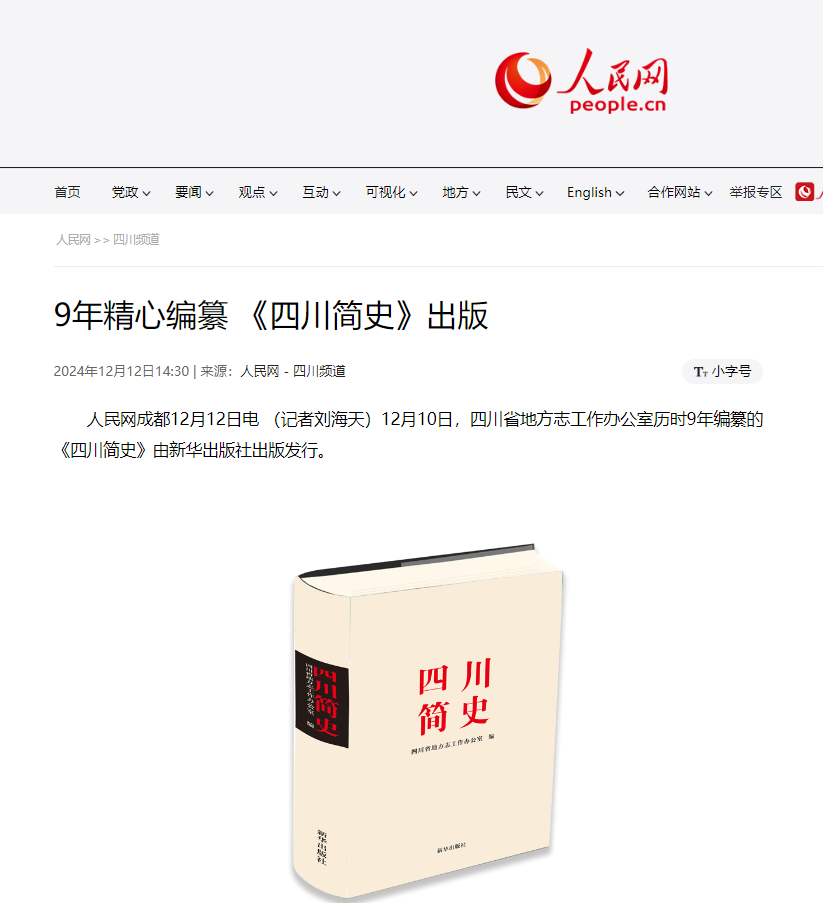 人民网成都12月12日电 (记者刘海天)12月10日,四川省地方志工作办公室历时9年编纂的《四川简史》由新华出版社出版发行。