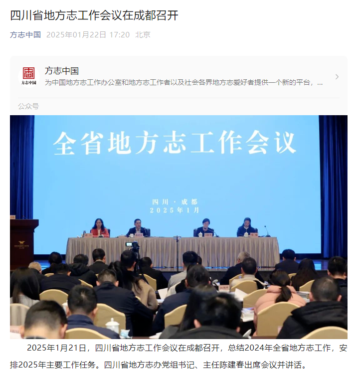 2025年1月21日,四川省地方志工作会议在成都召开,总结2024年全省地方志工作,安排2025年主要工作任务。四川省地方志办党组书记、主任陈建春出席会议并讲话。