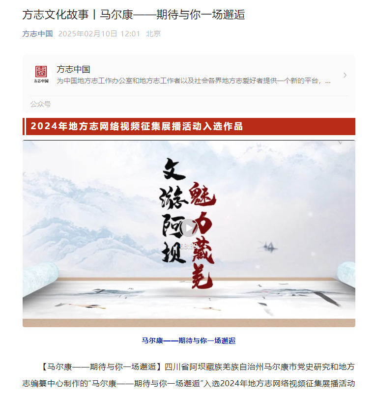 【马尔康——期待与你一场邂逅】四川省阿坝藏族羌族自治州马尔康市党史研究和地方志编纂中心制作的“马尔康——期待与你一场邂逅”入选2024年地方志网络视频征集展播活动(方志文化故事)。该作品于2024年6月发布于四川省情网,时长3分39秒,作品用地方志的视角,集自然风光、人文历史、民族文化以及现代化发展于一体,旨在通过音画交融,展示马尔康的独特魅力,突显其在现代化进程中的蓬勃生机。