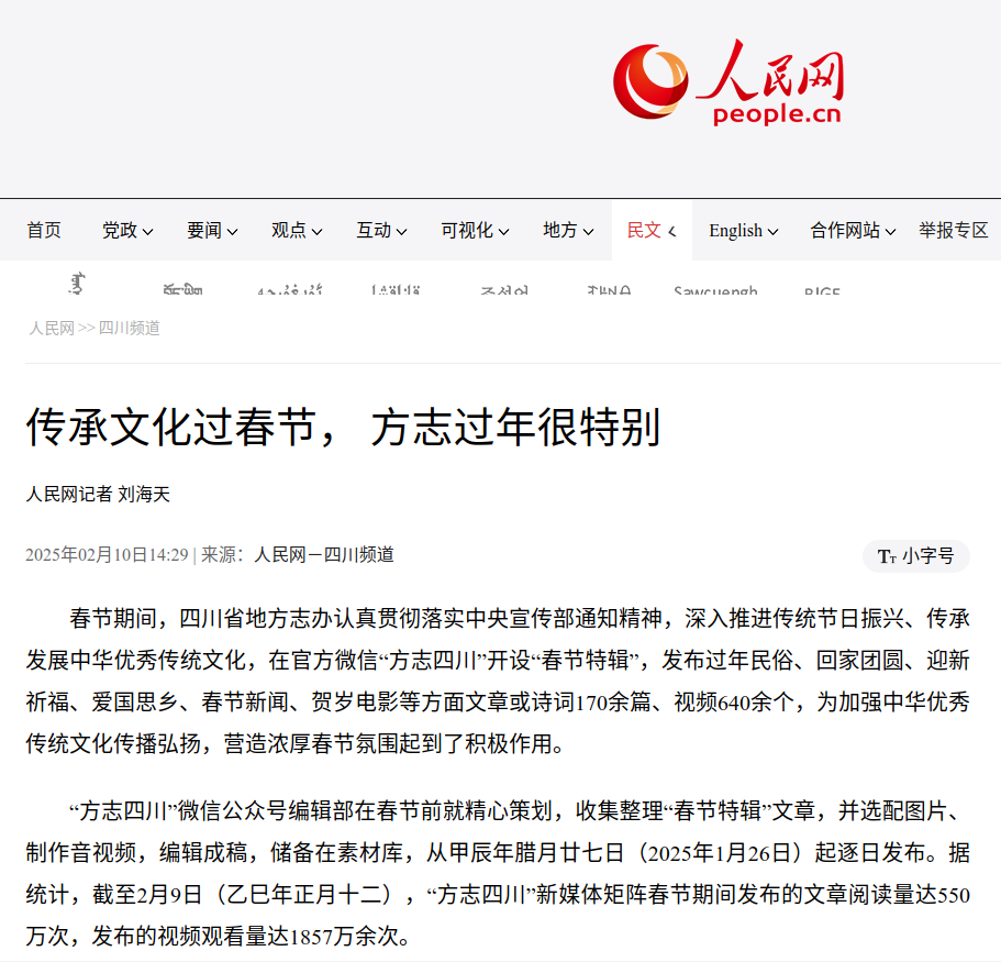 “方志四川”微信公众号编辑部在春节前就精心策划,收集整理“春节特辑”文章,并选配图片、制作音视频,编辑成稿,储备在素材库,从甲辰年腊月廿七日(2025年1月26日)起逐日发布。据统计,截至2月9日(乙巳年正月十二),“方志四川”新媒体矩阵春节期间发布的文章阅读量达550万次,发布的视频观看量达1857万余次。