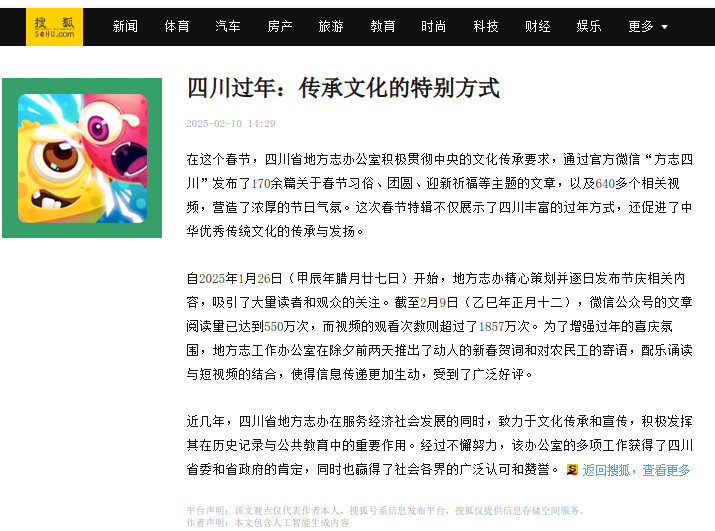 在这个春节,四川省地方志办公室积极贯彻中央的文化传承要求,通过官方微信“方志四川”发布了170余篇关于春节习俗、团圆、迎新祈福等主题的文章,以及640多个相关视频,营造了浓厚的节日气氛。这次春节特辑不仅展示了四川丰富的过年方式,还促进了中华优秀传统文化的传承与发扬。