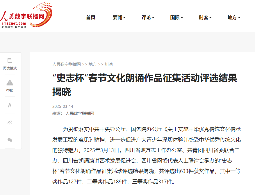 为贯彻落实中共中央办公厅、国务院办公厅《关于实施中华优秀传统文化传承发展工程的意见》精神,进一步促进广大青少年深切体验并感受中华优秀传统文化的独特魅力,2025年3月13日,四川省地方志工作办公室、共青团四川省委联合主办,四川省朗诵演讲艺术发展促进会、四川省网络代表人士联谊会承办的“史志杯”春节文化朗诵作品征集活动评选结果揭晓,共评选出633件获奖作品,其中一等奖作品127件,二等奖作品189件,三等奖作品317件。