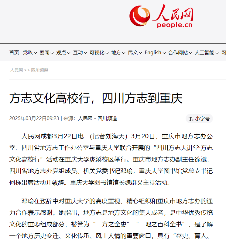 【人民网】方志文化高校行,四川方志到重庆