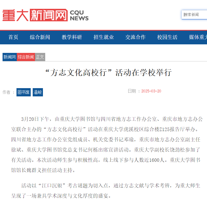 2025年3月20日下午,由重庆大学图书馆与四川省地方志工作办公室、重庆市地方志办公室联合主办的“方志文化高校行”活动在重庆大学虎溪校区综合楼Z125报告厅举办。四川省地方志工作办公室党组成员、机关党委书记邓瑜,重庆市地方志办公室副主任徐斌、重庆大学图书馆党总支书记何栎出席宣讲活动。重庆大学副校长饶劲松参加了有关活动。本次活动师生参与积极性高,线上线下参与人数近1600人。重庆大学图书馆馆长魏群义担任活动主持。