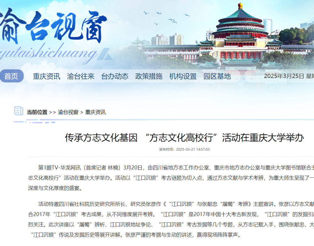 第1眼TV-华龙网讯(首席记者 林楠)3月20日,由四川省地方志工作办公室、重庆市地方志办公室与重庆大学图书馆联合主办的“方志文化高校行”活动在重庆大学举办。活动以“江口沉银”考古谜题为切入点,通过方志文献与学术考辨,为重大师生呈现了一场兼具学术深度与文化厚度的盛宴。