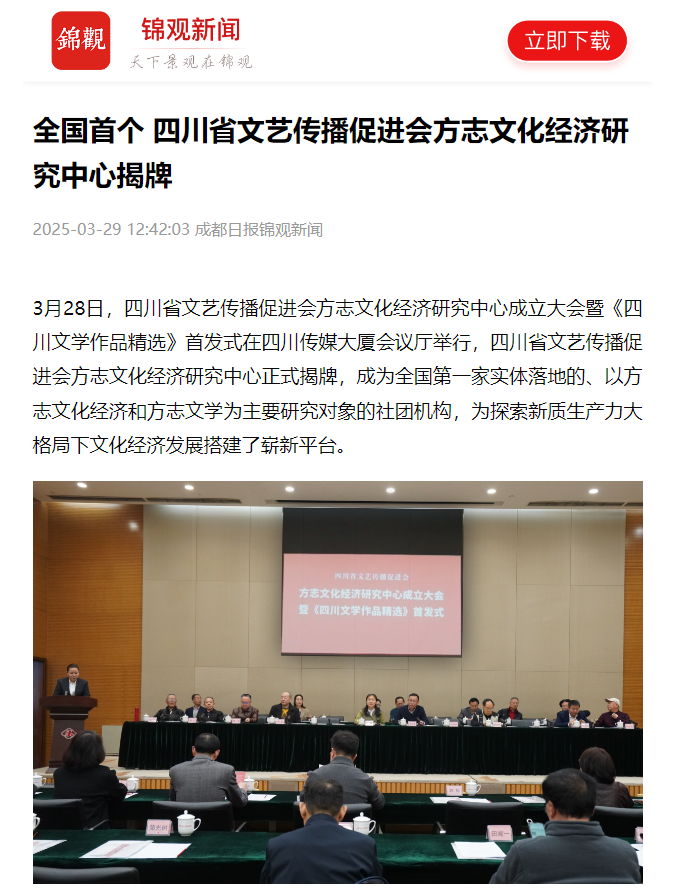 【成都日报锦观新闻】全国首个 四川省文艺传播促进会方志文化经济研究中心揭牌