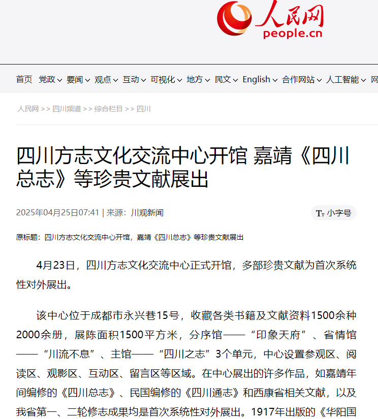 【人民网-四川频道】四川方志文化交流中心开馆 嘉靖《四川总志》等珍贵文献展出