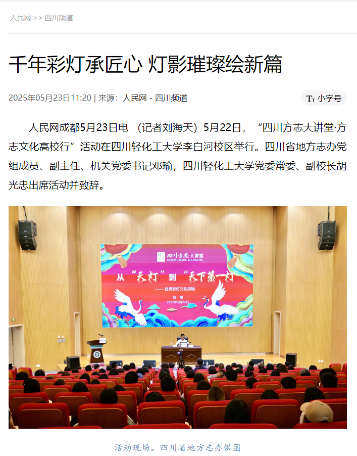 本次活动主讲嘉宾由四川省方志文化宣讲队成员、自贡市地方志办公室副主任刘刚担任。他以《从“天灯”到“天下第一灯”——自贡彩灯文化探秘》为题,从“自贡彩灯的前世今生、自贡彩灯的艺术魅力、自贡彩灯的历史嬗变、自贡彩灯的时代价值”4个层面,详细阐述了自贡彩灯的历史发展、现代演变、文化传承与保护、制作工艺等。宣讲形象生动、幽默风趣,赢得在场师生及广大网友一致好评。
