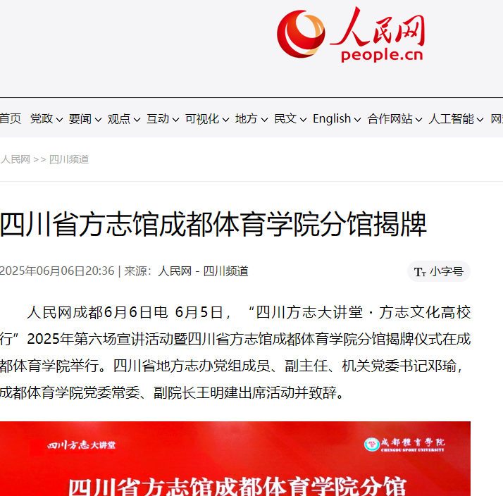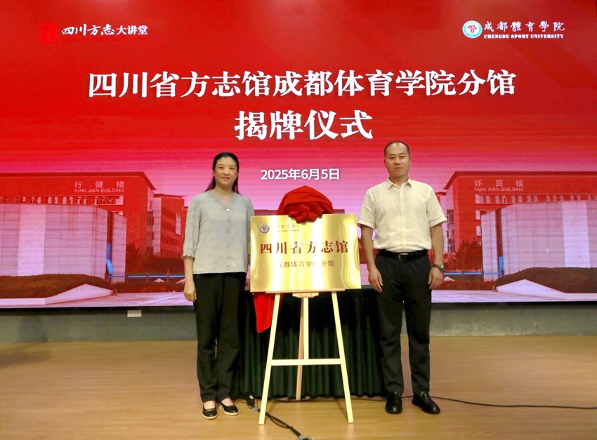 人民网成都6月6日电 6月5日,“四川方志大讲堂・方志文化高校行”2025年第六场宣讲活动暨四川省方志馆成都体育学院分馆揭牌仪式在成都体育学院举行。四川省地方志办党组成员、副主任、机关党委书记邓瑜,成都体育学院党委常委、副院长王明建出席活动并致辞。