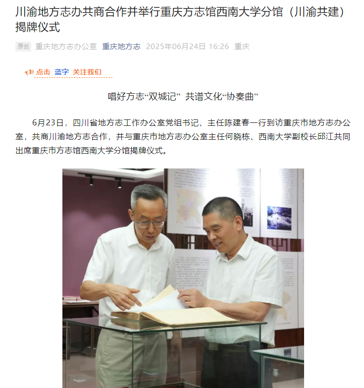 【重庆地方志】川渝地方志办共商合作并举行重庆方志馆西南大学分馆(川渝共建)揭牌仪式