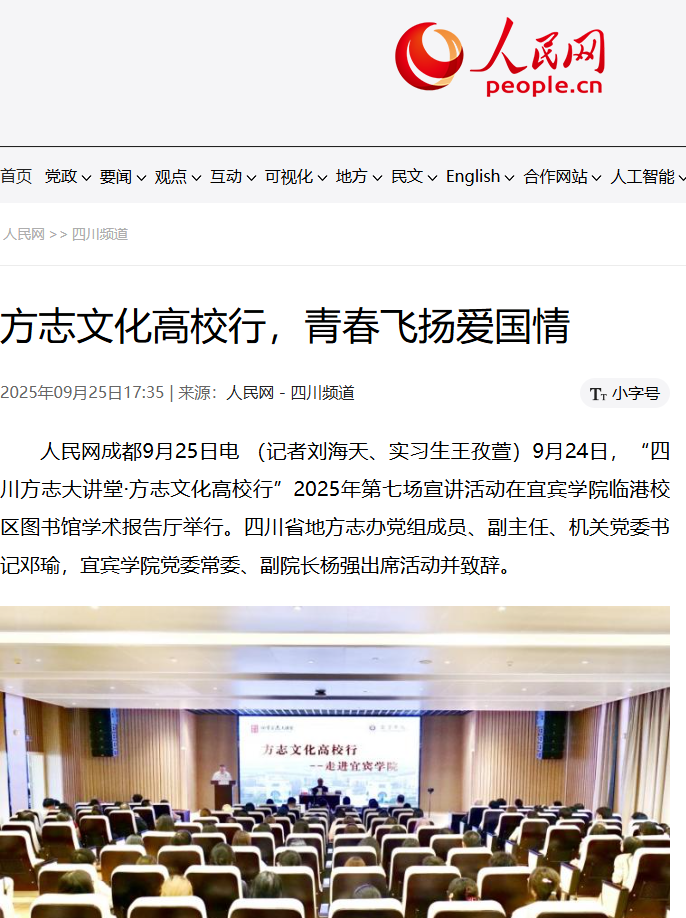 人民网成都9月25日电 (记者刘海天、实习生王孜萱)9月24日,“四川方志大讲堂·方志文化高校行”2025年第七场宣讲活动在宜宾学院临港校区图书馆学术报告厅举行。四川省地方志办党组成员、副主任、机关党委书记邓瑜,宜宾学院党委常委、副院长杨强出席活动并致辞。
