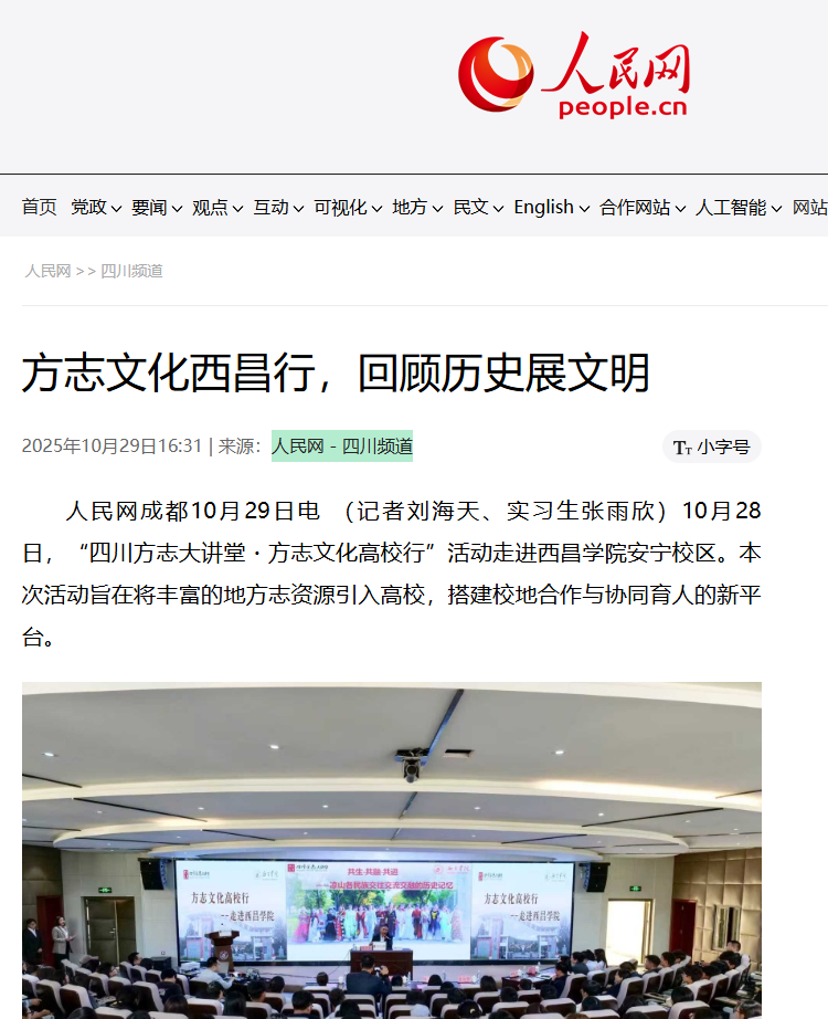 人民网成都10月29日电 (记者刘海天、实习生张雨欣) 10月28日,“四川方志大讲堂・方志文化高校行”活动走进西昌学院安宁校区。本次活动旨在将丰富的地方志资源引入高校,搭建校地合作与协同育人的新平台。