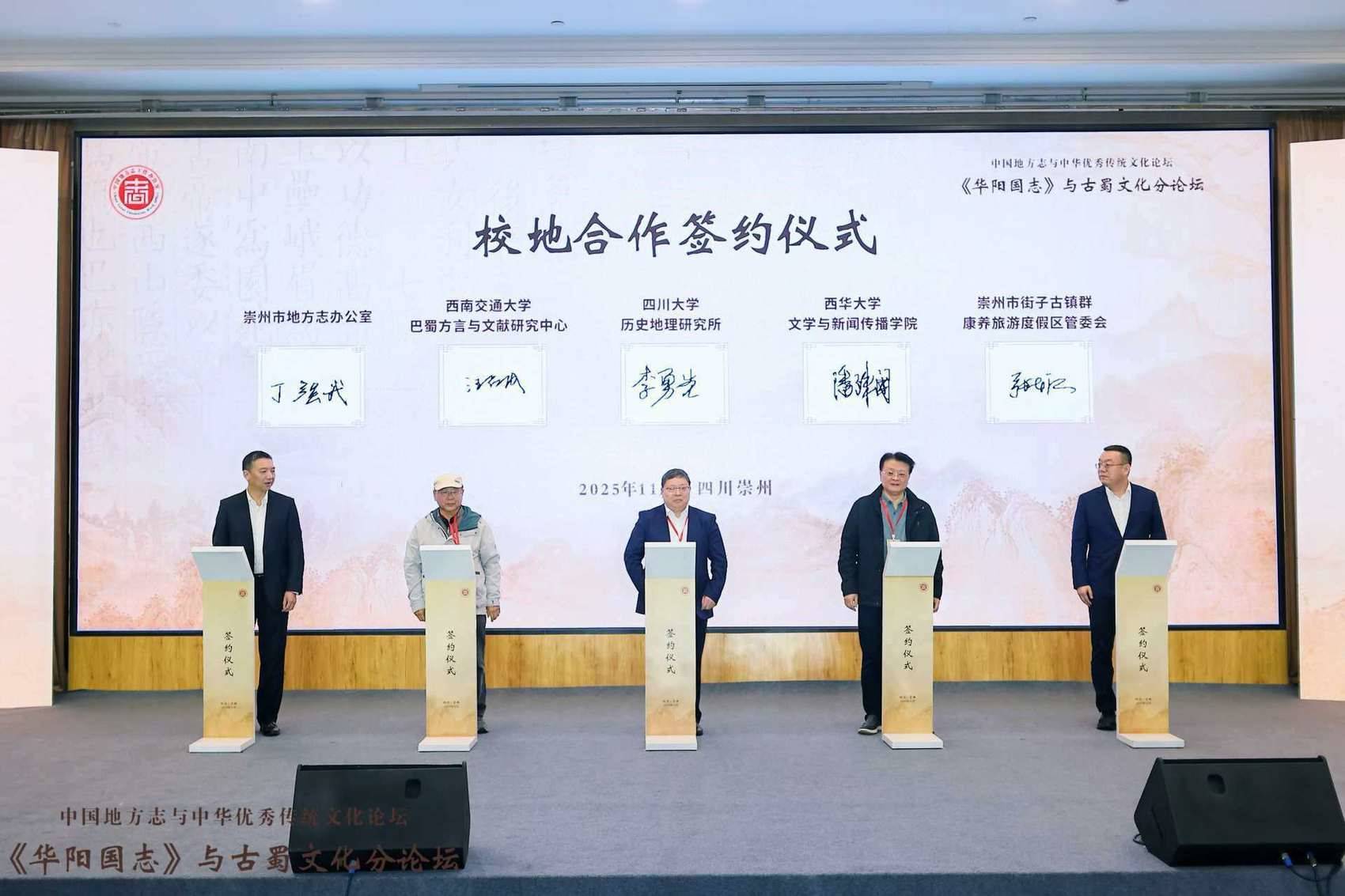活动中,崇州市地方志办公室、崇州市街子古镇群康养旅游度假区管委会,分别和西南交通大学巴蜀方言与文献研究中心、西华大学(文学与新闻传播学院)、四川大学历史地理研究所签订合作协议。崇州将借助高校科研机构的力量,系统整理、校勘及研究《华阳国志》,深入挖掘古蜀文化的历史内涵与时代价值,推动古蜀文化与地方文化建设相结合,提升崇州市文化软实力与社会影响力。