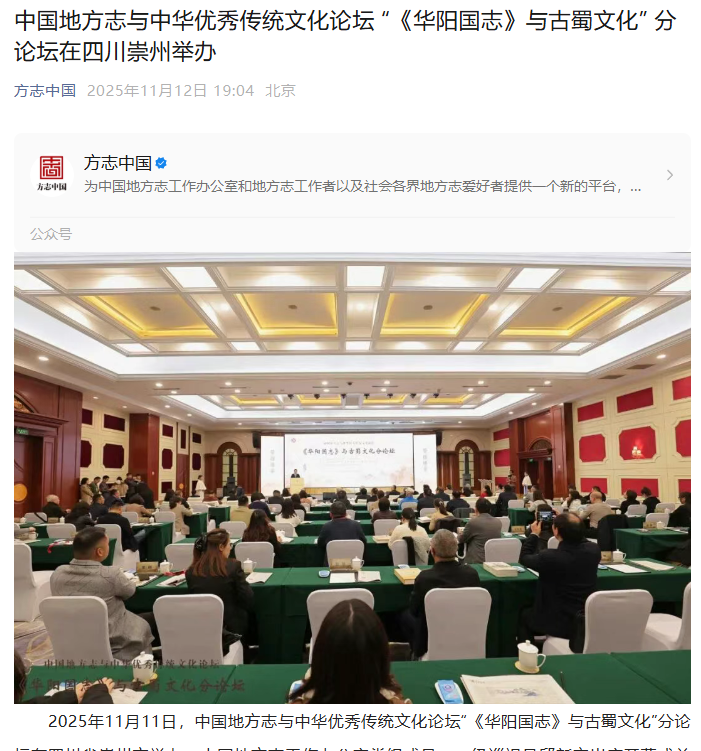 2025年11月11日,中国地方志与中华优秀传统文化论坛“《华阳国志》与古蜀文化”分论坛在四川省崇州市举办。中国地方志工作办公室党组成员、一级巡视员邱新立出席开幕式并讲话。四川省地方志工作办公室党组书记、主任陈建春,重庆市地方志办公室主任何晓栋,崇州市委副书记、市长饶程出席开幕式并致辞。四川省地方志工作办公室党组成员、副主任刘自强主持开幕式并做会议总结。河南省委党史和地方史志研究室副主任、一级巡视员张守四,陕西省地方志办公室党组成员、副主任、一级巡视员吴玉莲,云南省地方志编纂委员会办公室副主任杨冬莉出席论坛。