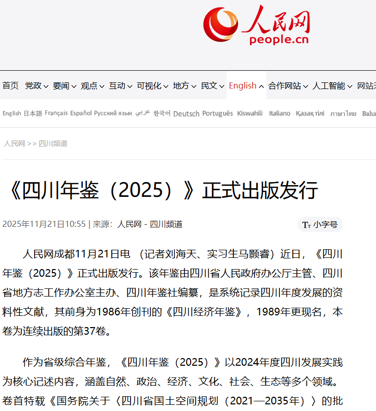 人民网成都11月21日电 (记者刘海天、实习生马颢睿)近日,《四川年鉴(2025)》正式出版发行。该年鉴由四川省人民政府办公厅主管、四川省地方志工作办公室主办、四川年鉴社编纂,是系统记录四川年度发展的资料性文献,其前身为1986年创刊的《四川经济年鉴》,1989年更现名,本卷为连续出版的第37卷。