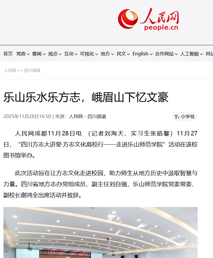 人民网成都11月28日电 (记者刘海天、实习生张皓馨) 11月27日,“四川方志大讲堂·方志文化高校行——走进乐山师范学院”活动在该校图书馆举办。