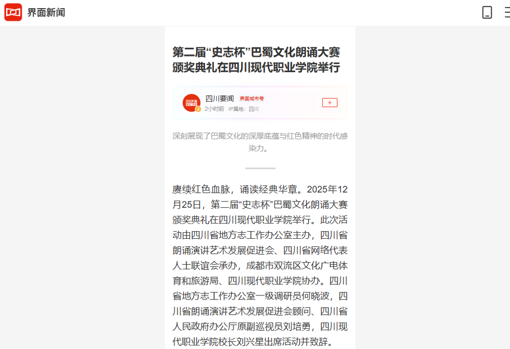 2025年12月25日,第二届“史志杯”巴蜀文化朗诵大赛颁奖典礼在四川现代职业学院举行。