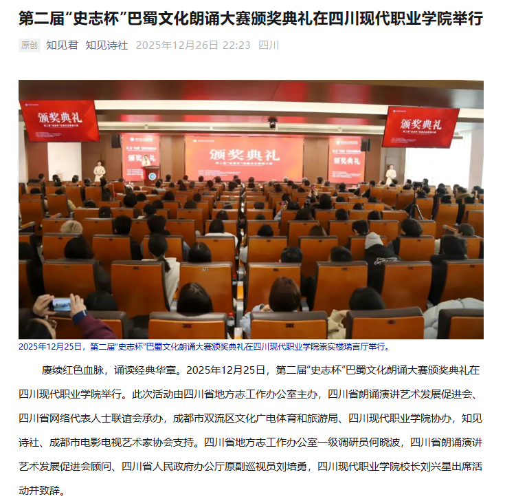【知见诗社】第二届“史志杯”巴蜀文化朗诵大赛颁奖典礼在四川现代职业学院举行
