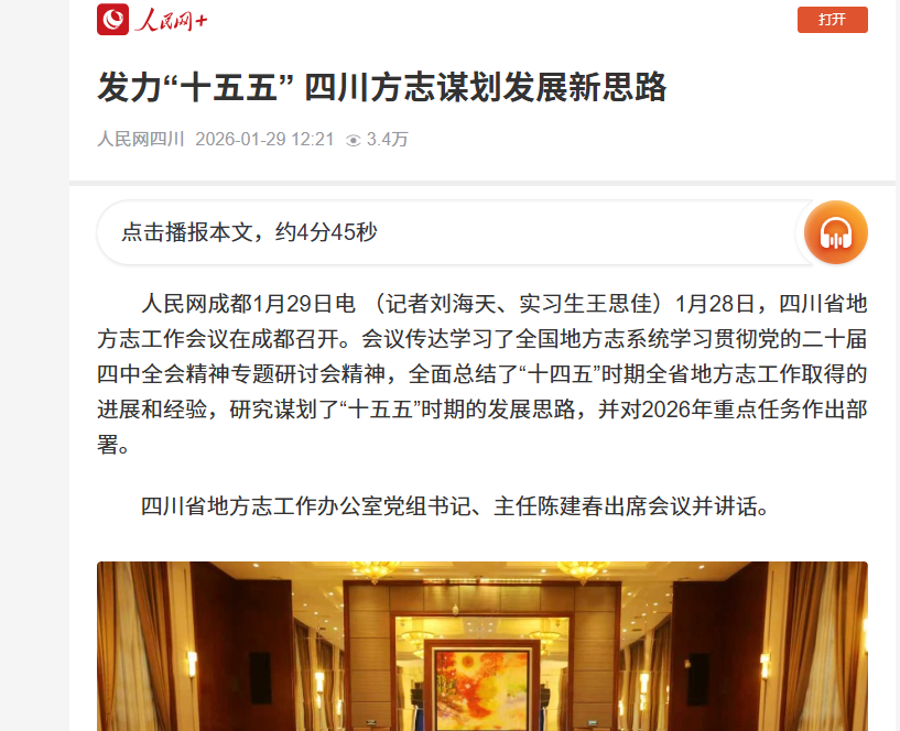 人民网成都1月29日电 (记者刘海天、实习生王思佳)1月28日,四川省地方志工作会议在成都召开。会议传达学习了全国地方志系统学习贯彻党的二十届四中全会精神专题研讨会精神,全面总结了“十四五”时期全省地方志工作取得的进展和经验,研究谋划了“十五五”时期的发展思路,并对2026年重点任务作出部署。