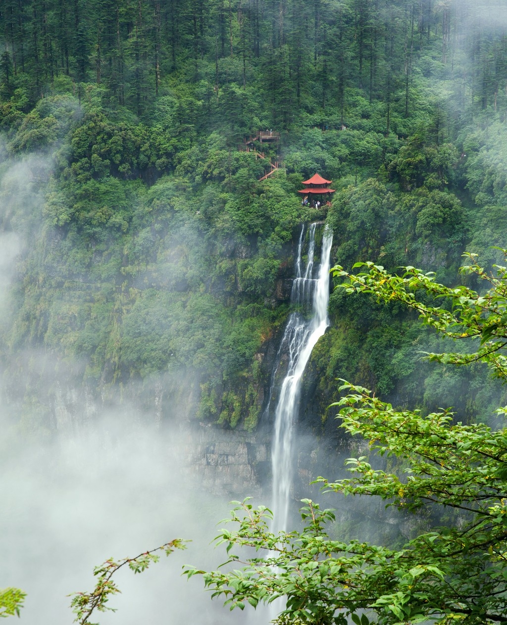 瓦屋山,与峨眉山并称“蜀中二绝”,是大峨眉国际旅游区重要组成部分,峨眉山—瓦屋山—周公山“三山”构成川西南旅游金三角,其森林覆盖率超过95%以上,在大面积的森林覆盖下保持着原生空气的纯度;瓦屋山山顶有108个泉眼、70多条瀑布,拥有世界多级落差最大的瀑布之——的兰溪瀑布,瀑布高达1040米;山上还有植物3600多种,其中国家一级保护植物7种,国家二级保护植物31种,有数十万亩杜鹃、珙桐,这里被誉为“世界杜鹃花的王国”和“中国鸽子花的故乡”。