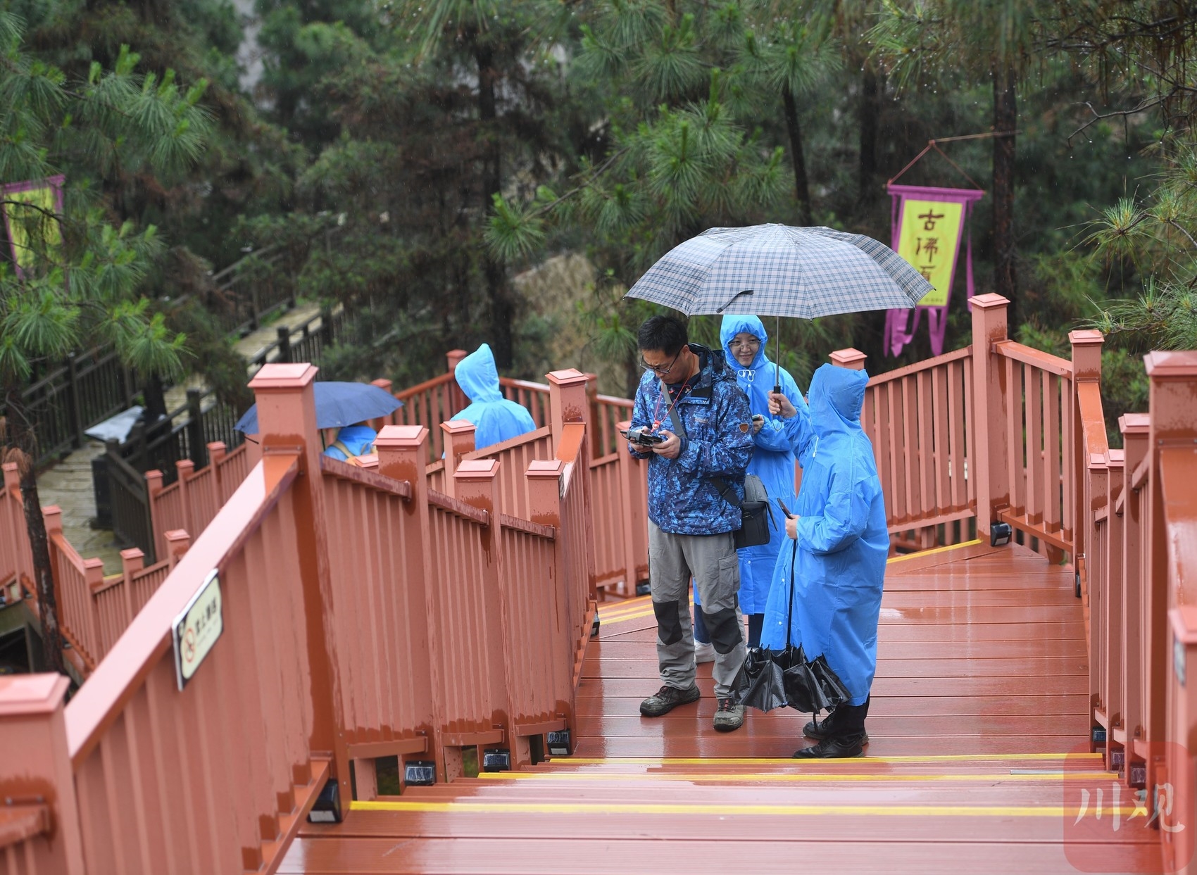 在古佛顶景区采风过程中,来自成都温江区的摄影爱好者倪伟说:“我就喜欢这样具有历史文化厚重感的景点,雨中的盐煤古道就像一幅水墨画。”川观拍客严冰用无人机低飞拍摄盐煤古道,“刚刚航拍了古佛顶景区,非常震撼。用另一个视角,低空飞行,来捕捉历史的细节。”