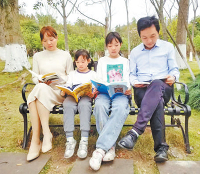 “开始看书啦!”晚上9点,陈静做完家务,招呼丈夫贺玮杰和两个女儿到书架上各自取书,在客厅围坐在一起,阅读分享。这样的亲子时光,在重庆市荣昌区市民陈静家已是寻常。两个80后带着两个10后,每周一次家庭阅读分享会,每年一份家庭心愿书单……一家人在书香中共同成长。