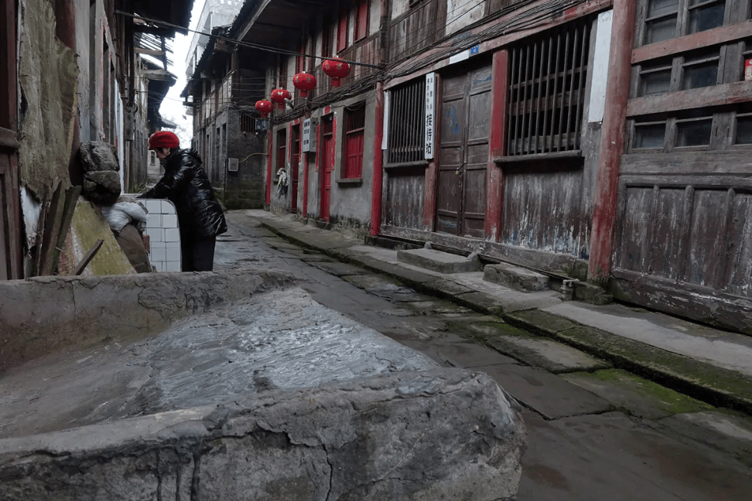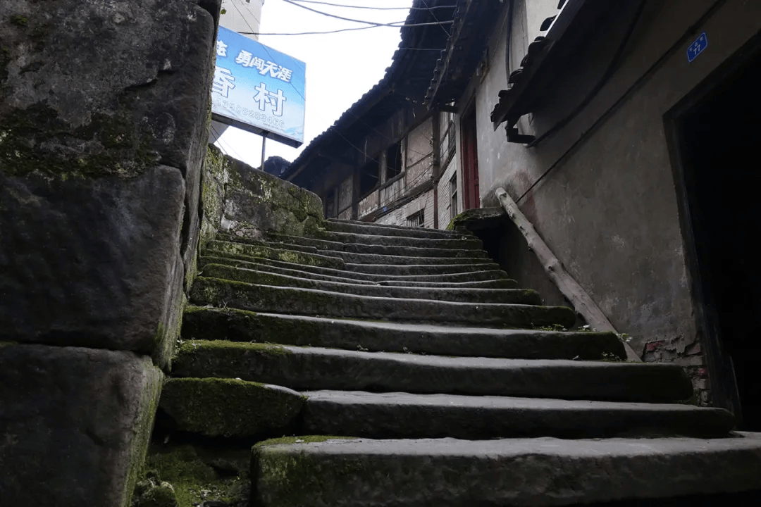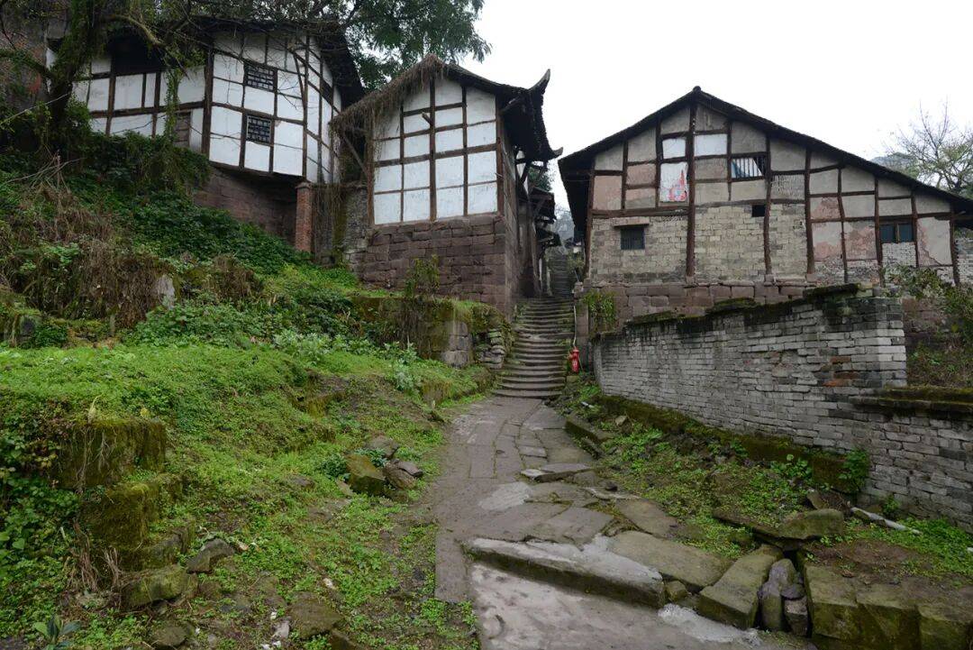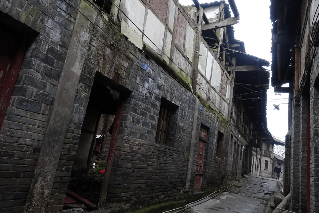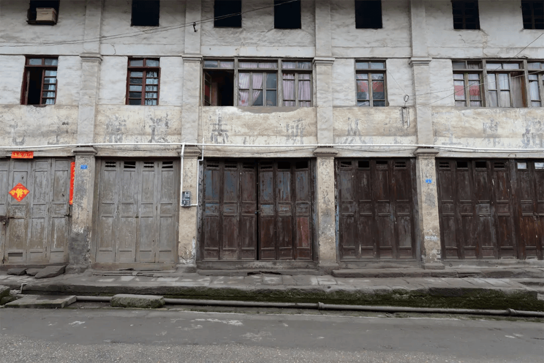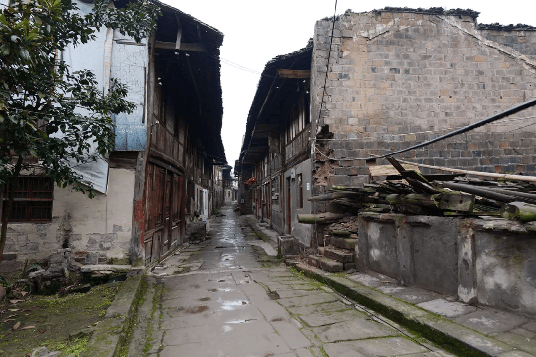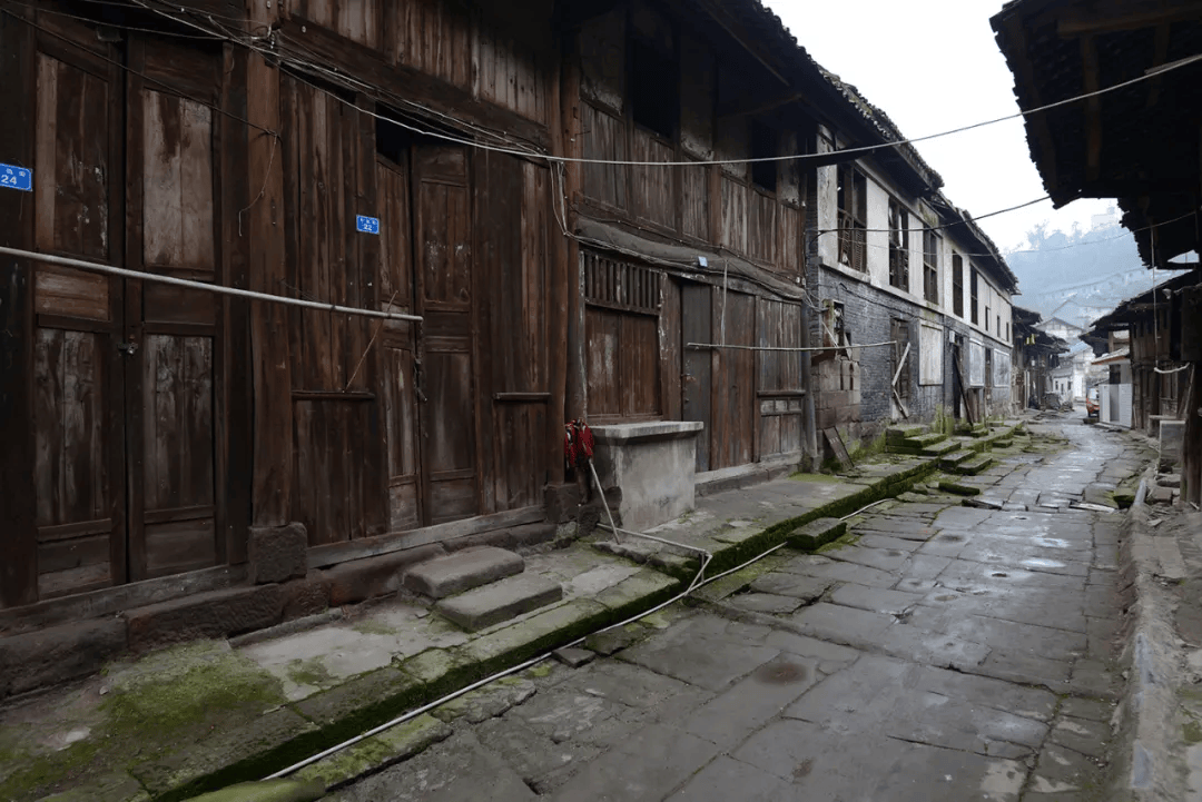 场镇上保留下来的老街道有解放街(铁铺街)、胜利街、民主街(石家湾街)、半边街和锅市街等。胜利街很短,在靠山的最高处,沿陡长的石台阶可走到山梁后。整齐的青石板铺设、约三米宽的半边街,古旧地道。小街临山,街两边都是带有石础、石阶的穿木式传统木构建筑体,建筑临街面多设计为商铺式样,门面高、开间阔。建筑以两层为多,风貌样式近似,其中一些房屋破败,露出高大的古砖墙体和巨石建构,其早年的富丽堂皇让人触目兴叹。半边街一头沿石梯可直通江边码头,另一头与解放街相连。古朴、宁静,走在半边街中让人恍若有回到古时的感觉,遐想连连。解放街是场上较为热闹的街,该街向场中横向延伸的一段为锅市街。锅市街两边多为20世纪上半叶先后建造的连排楼房,据称这些楼房多为旧时县属各部门的公房。这些临街楼房也极具看点,建筑样式和建筑材料具有时代特点外,还能在其中建筑外立面上看到一些旧时的标语口号。