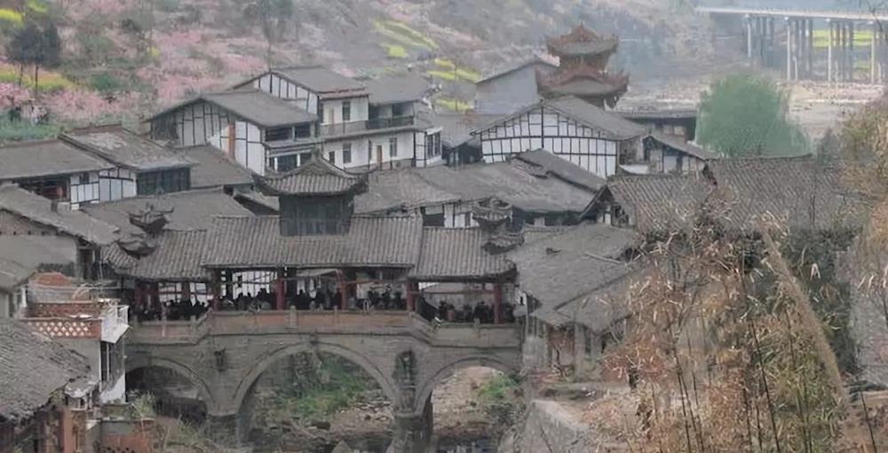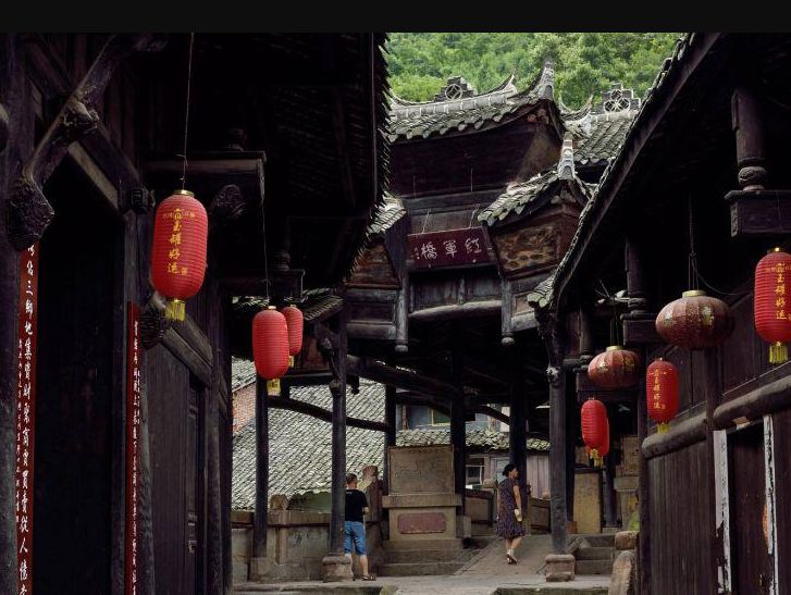 踏着长长的石板路往廊桥走去,廊桥在新街的西端。这是一座建于清代的石拱廊桥,长23.7米,宽6.5米,拱高7.8米。桥面上建木质桥楼,穿斗式屋架,小青瓦屋面,歇山式脊顶,是典型的川北地区的古代石拱桥,桥内各条拱石沿横向形成整体,反映出石拱结构技术的地方色彩。桥面上有造型精致的桥楼,桥楼刻绘有各式花纹图案及少数浮雕人物,造型优美。