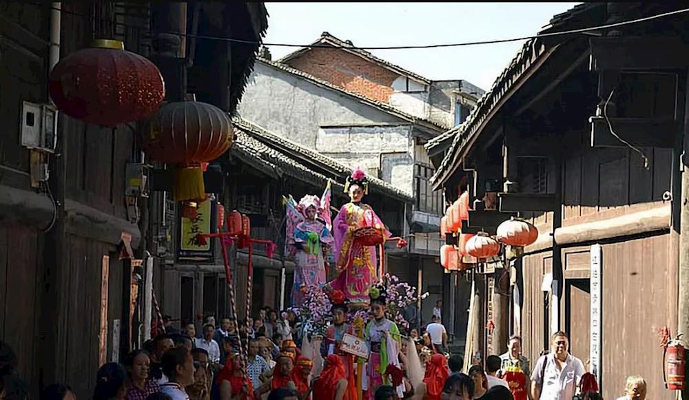“文昌出巡了!文昌出巡了!”青林口古镇骤然炸响鞭炮声,原本拥挤在逼窄的小街上张望打探的乡民,迅速地退向两边的街沿,为文昌出巡的队伍腾出路。在古镇的高台戏传习所,72岁的邓均朝讲述起高台戏巡演的盛况时,脸上神采飞扬。