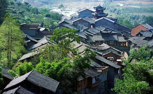 沿着一条蜿蜒的小道,步入古镇新街,街道不宽,古老的石板路两边都是老房子,采用古式檐式木结构修建,也有四合院、三进台式建筑,还有奇特的悬空吊脚楼,都是典型的明清建筑。家家门前栽阔叶梧桐,枝繁叶茂,遮天蔽日。