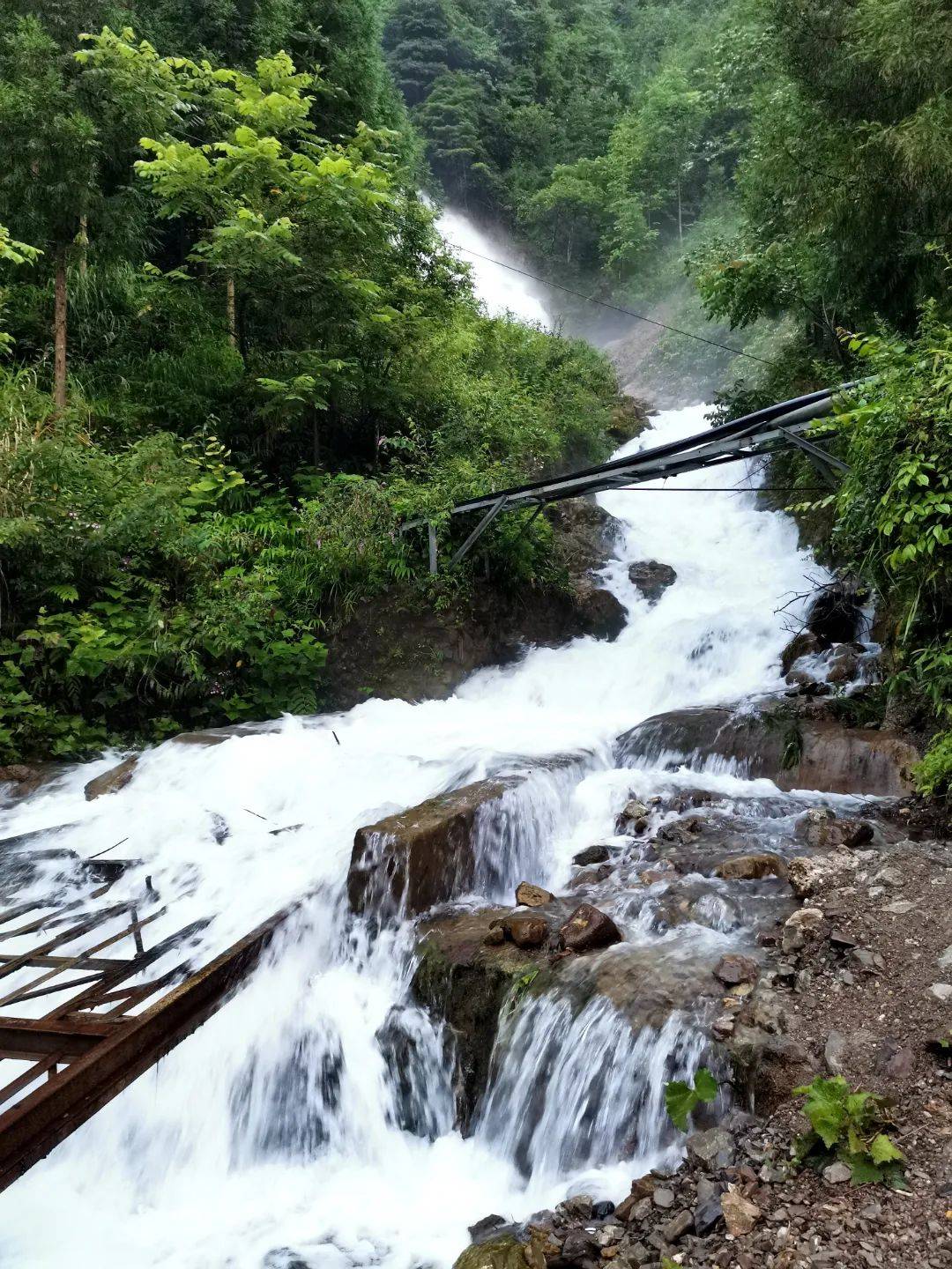 在山路的拐弯处,有一个浅水滩,水流过路面,几位游客在此赤脚戏水,旁边有树木搭成的简易木桥,可沿着这木桥走到对面,一直到山的深处去。但那里又有怎样的风景,却是不得而知的。有风时不时吹过来,瀑布的水雾就飘散过来,带来了些许凉意。我站在山路边上,用手机拍下瀑布的视频。同行的记者对着瀑布长枪短炮式的狂拍,显得有点儿夸张。