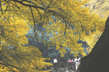 将近上午10点,游人渐渐多了起来,山林有了人语声。众多游人都是奔着九子银杏来的。九子银杏旁边的观景平台上,一棵高大的古银杏撑开金色大伞,蓬蓬勃勃,与九子银杏相互辉映。这里是人们拍摄、留影的最佳位置,但凡来此一游的人,都会在这个平台上与九子银杏合上一张影。