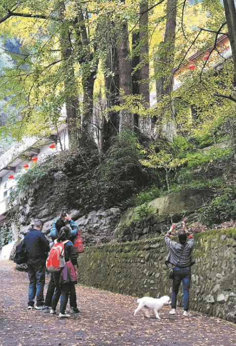 白岩寺整个山林瑞气氤氲,峻峭的白岩宛若一面两翼展开的巨大屏风,在阳光下闪耀着白亮的银光。层叠的庙宇、树木、阶梯错列在白色巨崖下,迎着东方的朝阳。遇上冬日温暖的阳光,山林间所有的植物如被激活一般,不只银杏,还有水杉、枫、樟、楠、柏、槐、桐、漆、棬、栾树、黄连木以及叫不出名的杂树,赤橙黄绿青蓝紫,道不出的惊艳。那些树,个个风姿绰约,生机盎然,或俊俏雄奇,或华贵典雅,或婉约含蓄,仿佛都穿上了节日的盛装,共赴一场惊天动地的金色盛宴。