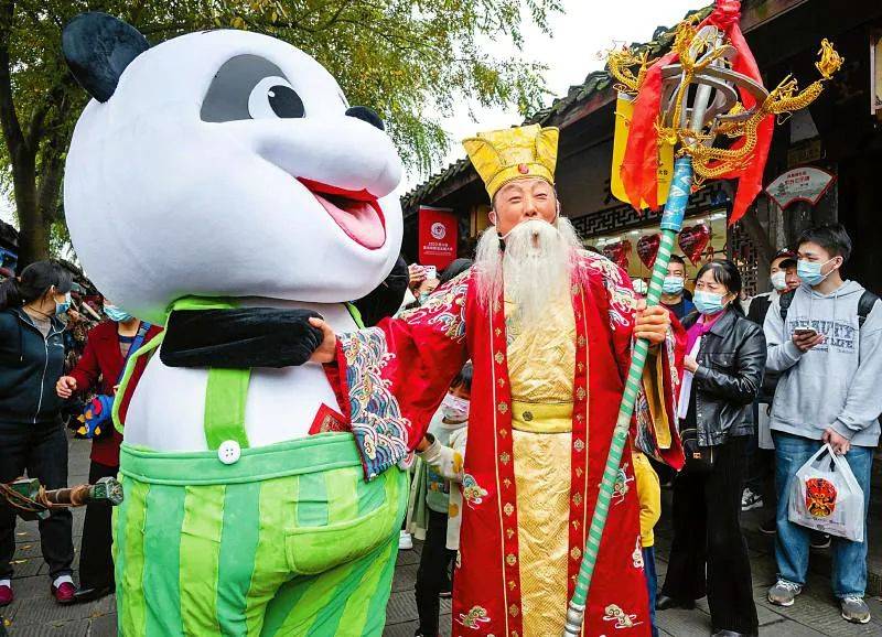 “春节老人”与“安逸熊猫”同游古城(阆中市委宣传部 供图,图源:四川日报)