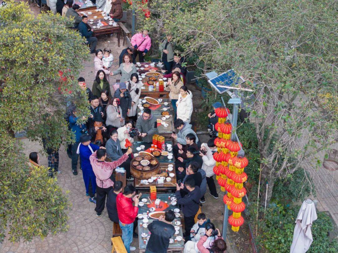 走进农家小院,露天的坝子里整齐地摆满了桌椅,红色的桌布在阳光下明艳动人,与周边翠绿的田园风光相互映衬,别有一番韵味。忙碌的身影穿梭其中,妇女们在临时搭建的灶台前熟练地翻炒着菜肴,袅袅炊烟携带着诱人的香气弥漫开来,令人馋涎欲滴;男人们则忙着搬运桌椅、仔细摆放餐具。