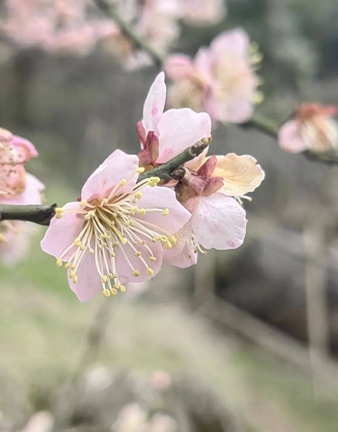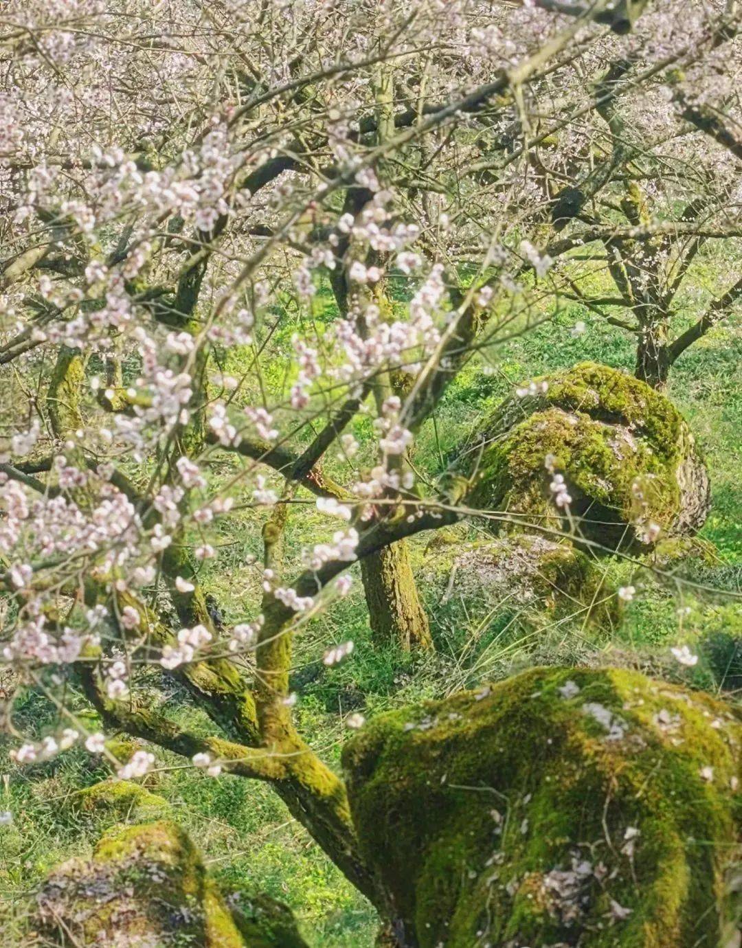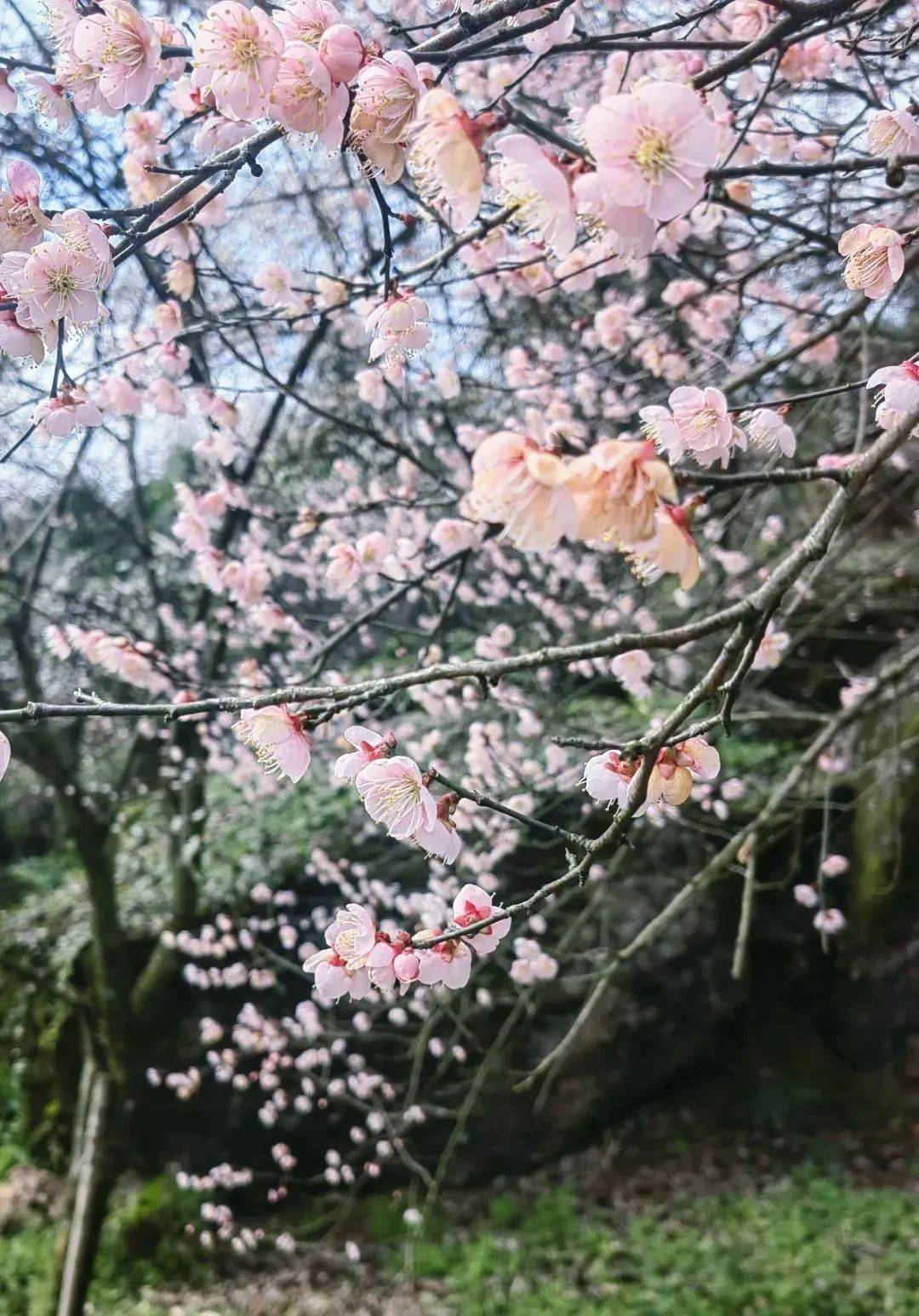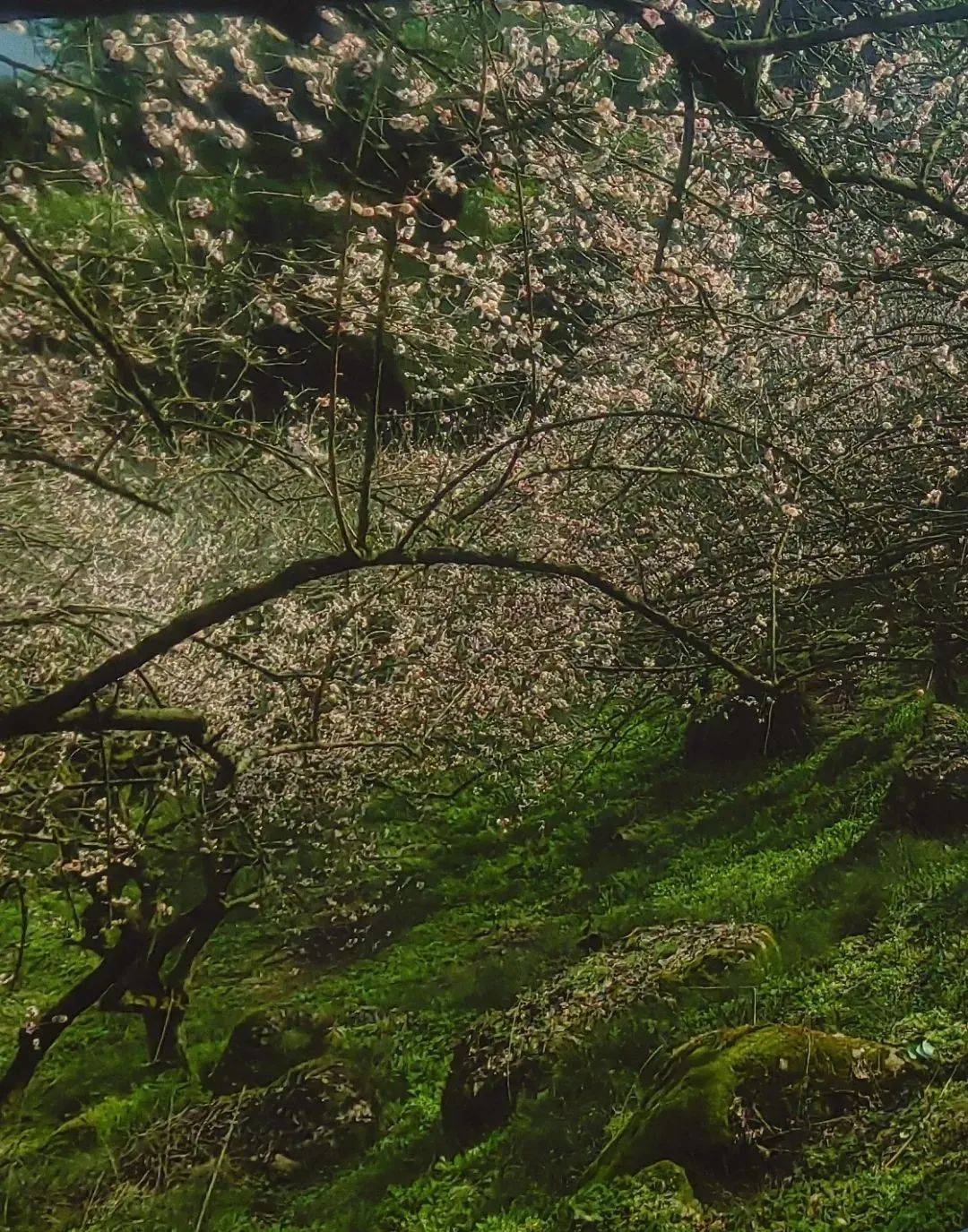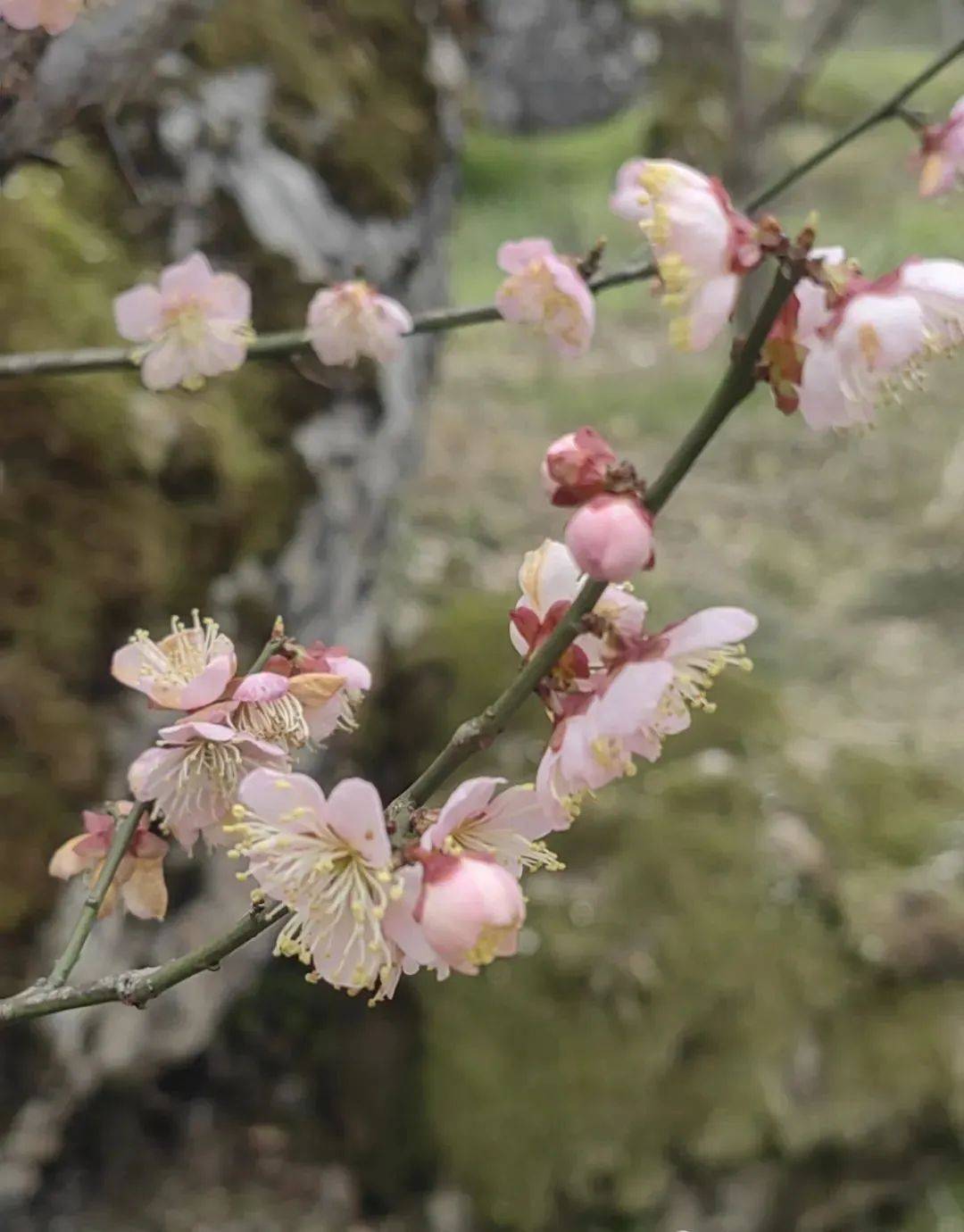 我们走在山间小路,与那些矮小的梅树亲密接触。山坡上的石头,布满了青苔,泛着绿油油的光,极具生命力。粉红的梅花,在石头的映衬下,色彩搭配张力十足,格外好看。