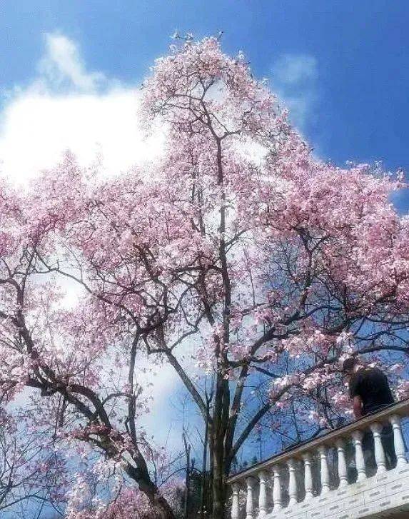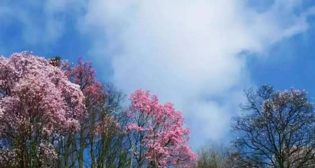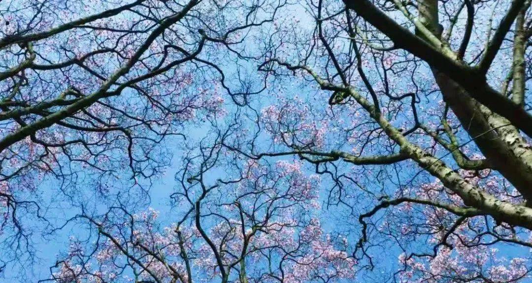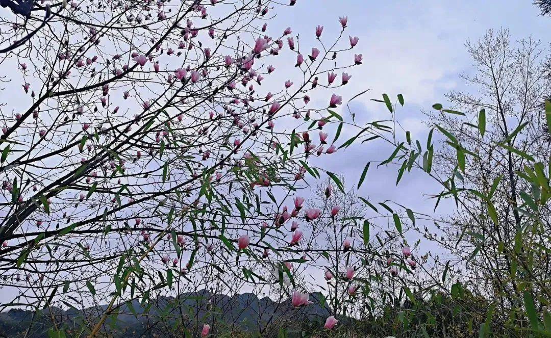 辛夷树树干高大,最高可达30多米。站在山顶俯瞰,漫山遍野的辛夷花点缀着高山,放眼望去是一片粉色的花海。走进树林,抬头,仰望,粉色的花朵在蓝天的映衬下,灿若云霞。正可谓“花如琼片叶如云,隔水残霞日半曛”。徜徉在这花海中,有花香与春风拂面,来时的失落消失殆尽。