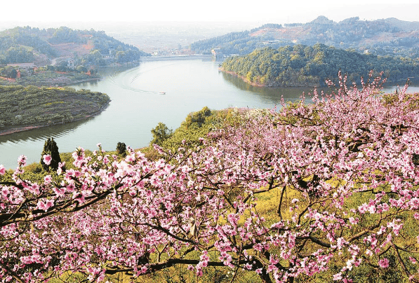 龙泉驿区有桃花逾万亩,被誉为“桃花故里”的山泉镇不但是观赏桃花的绝佳景点,尤宜水蜜桃和枇杷生长,1987年即被当时的农业部定为中国三大水蜜桃基地之一。每至春风骀荡,漫山遍野桃花簇簇,深红浅粉,如诗似画,醉人心怀。