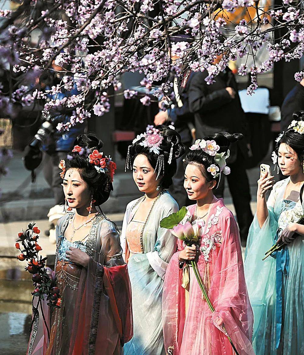 桃花的美好意象从唐诗宋词沿至明清文苑。小说《三国演义》第一回便是刘关张桃园结义,桃花无言证盟誓,展开了一段千年传奇。戏剧《桃花扇》,借才子佳人离合之情,赋国家社稷兴亡之感,“溅血点做桃花扇,比看枝头分外鲜。”一把纸扇,数点桃花,成为不屈不挠、反抗权奸的精神象征。还有《红楼梦》中的“黛玉葬花”,那是何等经典唯美……