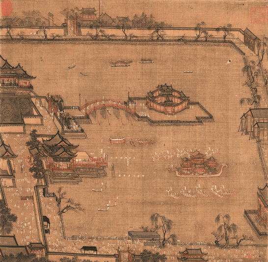 《金明池争标图》传为北宋画家张择端所绘,描绘了宋代皇家园林金明池里龙舟争标的激烈、紧张气氛。