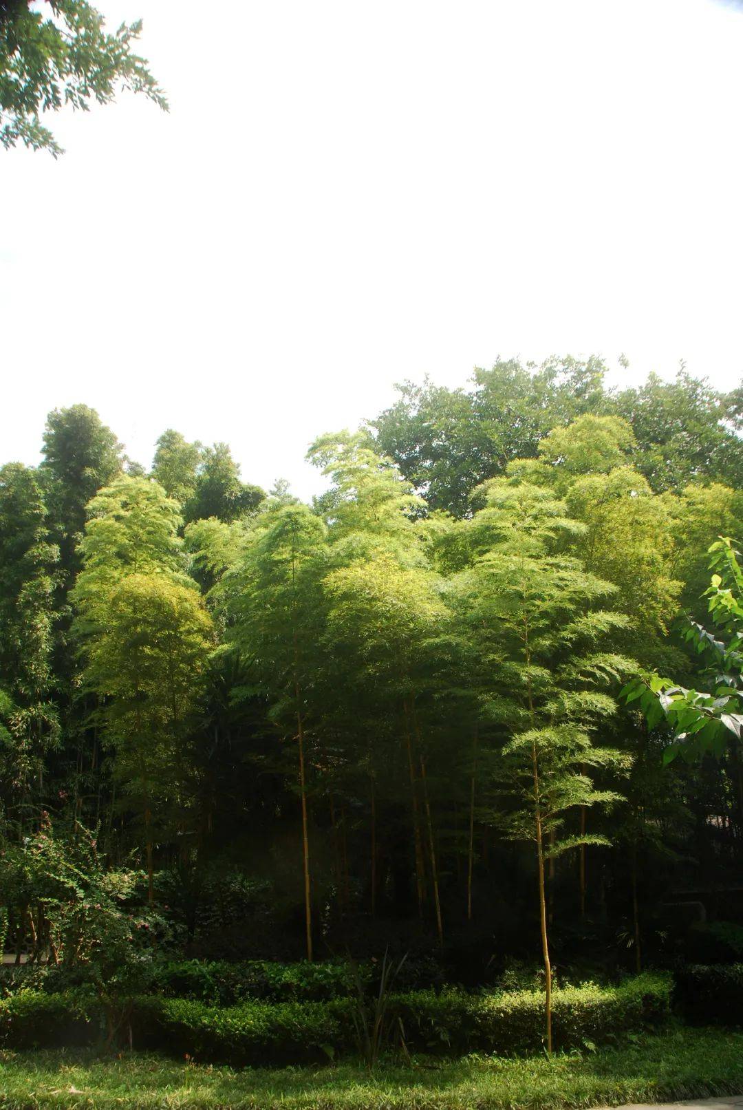 走出翠竹长廊,豁然开朗,又是一番新景色。晴空竹影摇曳,迷人眼目,亦真亦幻。低头寻路,道路分岔,或花径横斜,或曲径通幽,或回径蜿蜒,翠竹交错,或疏或密,恍若迷阵,不知该向何往。人在迷途,只能凭直觉。拣一条竹密林茂的路,边走边观竹赏景。粗看皆修身直节,狭叶似剑,难辨种类,细看才见异样端倪。有的节长,有的节短,有的节粗如佛肚,有的节细似人指,有的入云参天,有的低矮伏地,有的亭亭玉立,有的丰姿婆娑,有的金黄,有的碧绿,有的青翠……高莫过于云南龙竹,超越十层重楼;美最数金镶玉竹,竹竿通体金黄,偶现莹莹玉绿;奇当算龟甲竹,粗节若龟甲,似龙鳞,又好似人面。越走得林幽深,越见得竹奇异,越添得竹清趣。名筠佳篁,画姿诗韵,万千风情,叹为观止。