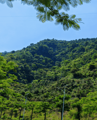 在朗朗晴空和阵阵山风之下,一排排凤凰树心领神会地扮演起了主人角色,争先恐后地向我们招手致意。它们又像军容严整、蓬勃朝气的仪仗队员,站着笔直的身板,列队迎接我们到来,并引导我们继续走向高处。