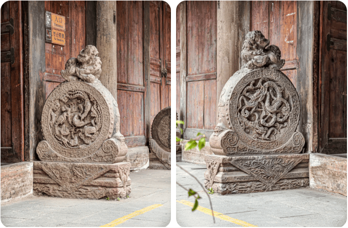 乐楼的三道门前,各置一对石鼓,每对石鼓均置于月牙形大青石基座上,鼓面鼓腹都有精致的浮雕装饰。其中大门左右两个石鼓的浮雕纹饰尤为别致,左边鼓面为二龙戏珠,右边鼓面为四凤朝亭,鼓腹各蹲有狮子一头,目光如炬,神威欲吼。