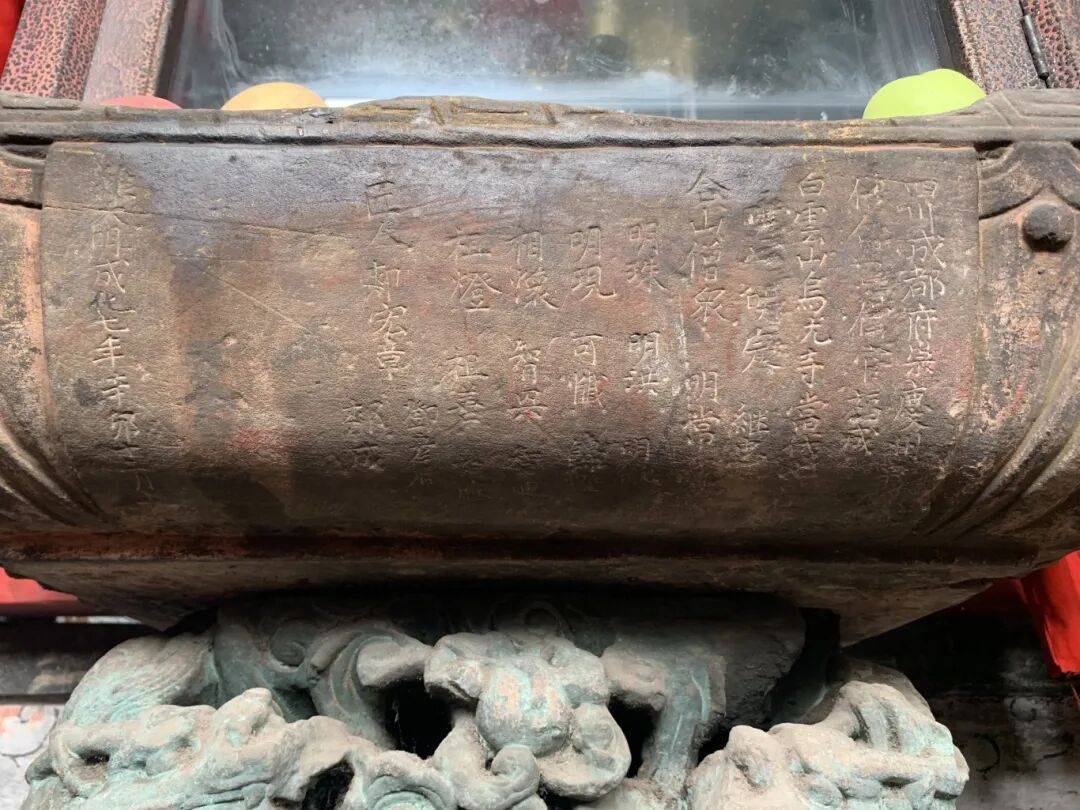 由题记可知,乌尤寺的这座香炉是由当时崇庆州的僧官福成同乌尤寺住持明心等人及合山僧众出资,请来匠人郏宏章、邓彦春、郏诚,于成化七年(1471年)雕造而成。