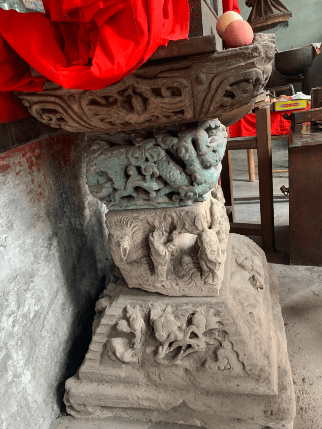 从下往上,第一层为须弥座,四周装饰莲叶和莲花纹;第二层四面雕刻人物像,包括佛像、胁侍童子、力士等;第三层镂空雕饰卷草纹和二龙戏珠;第四层雕刻缠枝牡丹卷草纹,正面中部打磨平整,上有题记一则,从左往右竖读为: